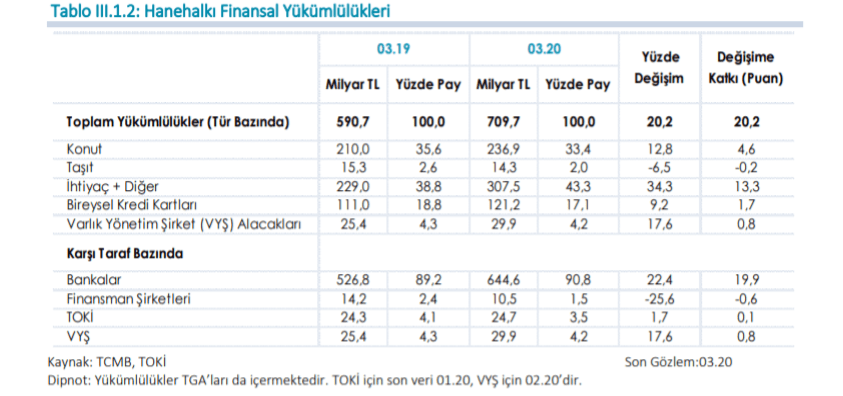 Finansal yönetimde şirket bilancolarını incelerken bir çok değişkene bakarız. İncelemelerde bakılan en önemli kalemlerden ikisi de varlık ve borç yapısıdır. Dolayısıyla hanehalkını da bir şirket gibi görerek her ikisi ile ilgili borç yapısını paylaşmak istedim. Geçtiğimiz seneye verileri ile birlikte paylaşılan tabloda otomotiv sektöründeki düşüşü, ihtiyaç ve konut kredilerindeki talep değişikliğini , ayrıca hanehalkının borçlarının muhattaplarını da görebiliriz. Dolayısıyla son desteklerde hanehalkını hareket kabiliyetinin nasıl olacağını da görebiliriz. Özellikle borç yapısı ve miktarı hanehalkı talebi için önemlidir.