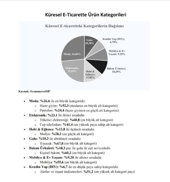 Paylaştığım bilgilerde değerlendirilmesi gereken noktaların başında bahsetmiş olduğum E-ticaret’in perakendeye oranıdır. Bu oranlama bir çok sektörün dönüşmesine neden oluyor ve daha derinlemesine olacaktır. Online ticaret alanlarına baktığımızda moda ve moda içerisindeki hazır giyim elektronik ile birlikte en hızlı ilerleyen alanladır. Genel değerlendirmeyi yaparken E-ticaret şirketleri arasında sadece iki Türk firmasının yer almakta olduğunu görüyoruz. Bu noktada ülkemizin her sektörde uluslararası ticaret stratejisine ihtiyacımız vardır.